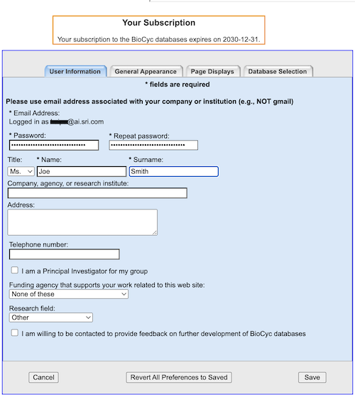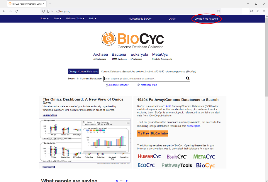 Creation of a free BioCyc account is required after an initial set of accesses even for paid subscribers. BioCyc accounts provide several benefits: