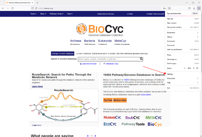 - Go to biocyc.org (or ecocyc.org etc) in Edge and click on the three dots button and then select "Settings"
